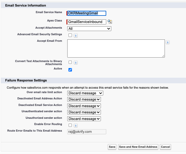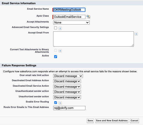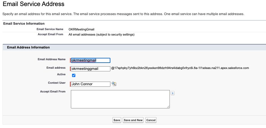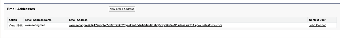 This will create a new Email Address for the Email Service. Any email sent to this email address will be processed by the Email Service we just set up. The Apex Class in the Email Service will read the email address to get the links and update the Meeting.
