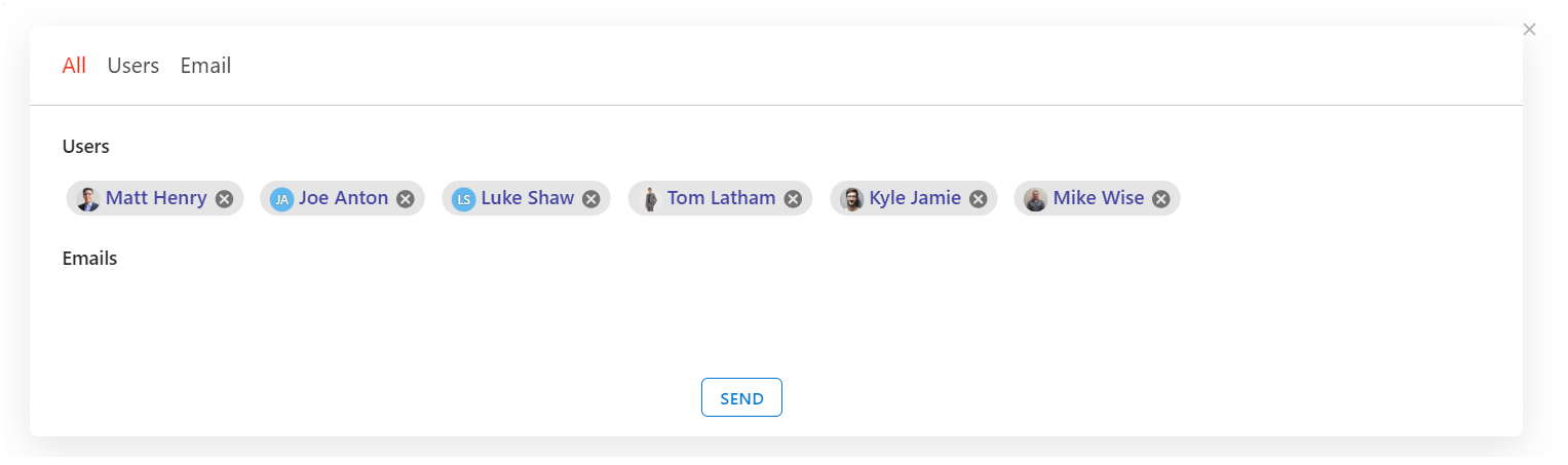 Clicking the Email in the button menu will open the Email popup. Users can be added in the Users tab and email addresses can be added in the email tab.