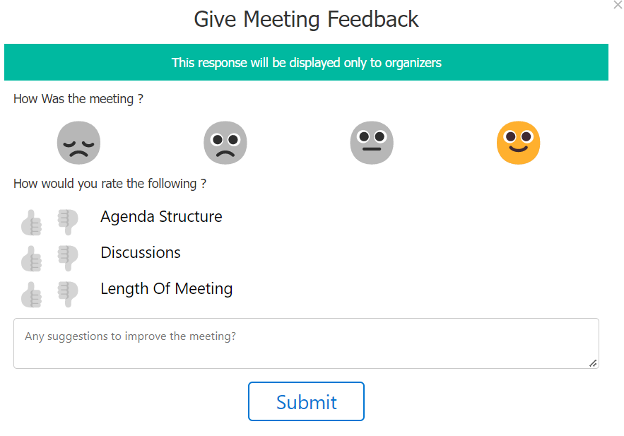 A meeting attendee or organizer can provide feedback by clicking the feedback button in a meeting. Feedback popup provides options to provide feedback for the meeting along with feedback for Agenda Structure, Discussions, length of Meeting along with additional comments to improve a meeting